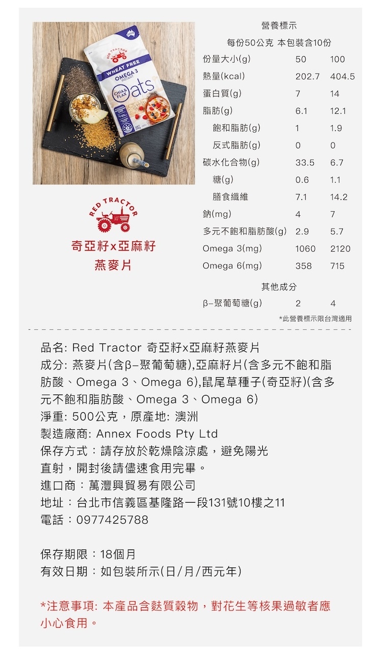◆澳洲Red Tractor奇亞籽& 亞麻籽(含Omega 3) 燕麥片效期:2026/5/26