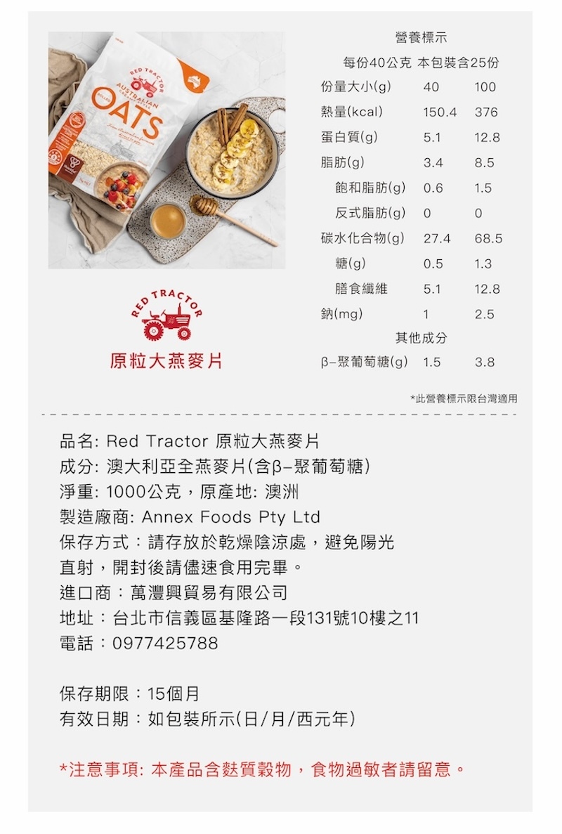 澳洲Red Tractor原粒大燕麥片(1000g)效期:2027/02/10